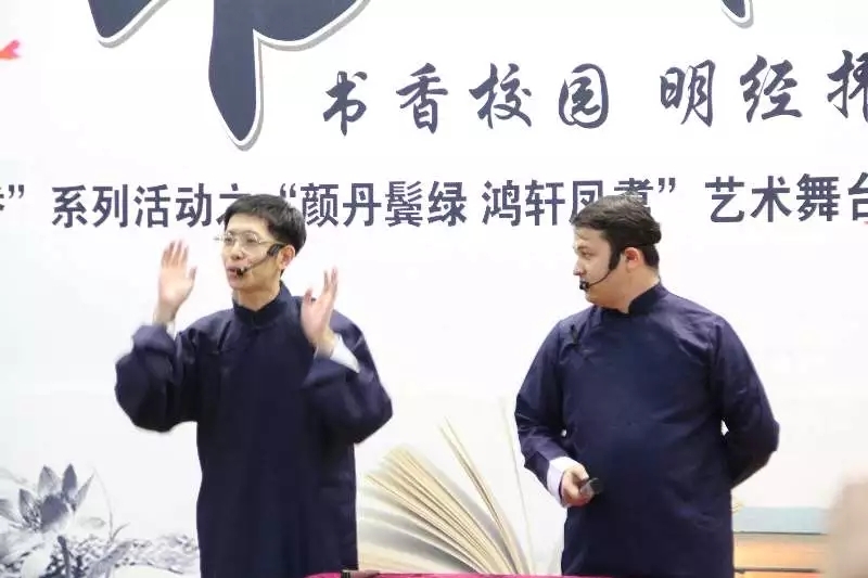 随后由管理学院团委书记依麻木江·沙力江与牟鸣琦同学为现场观众带来一段相声《讲究》,他们的说、学、逗、唱,引得台下老师和同学们欢笑不断,带动全场的氛围,掌声不断。