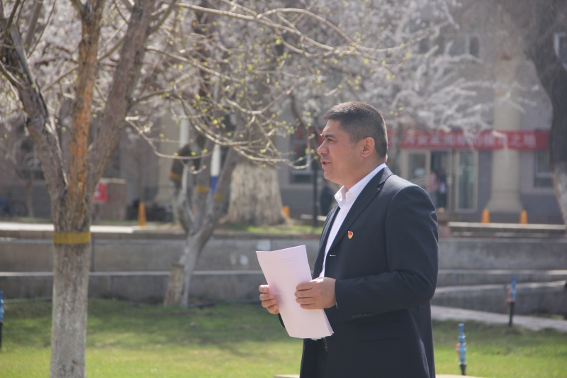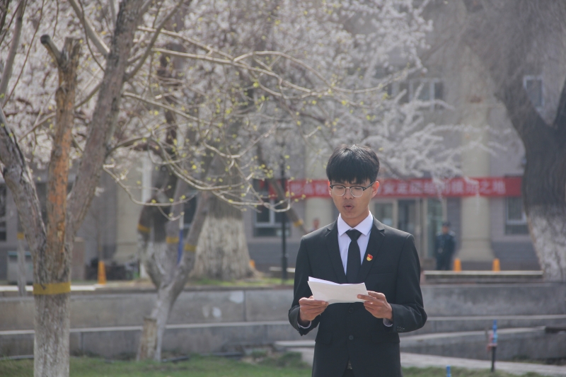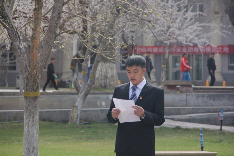 今天,我们要用坚定的信念和坚强的意志,捍卫革命先辈们的荣誉,继承革命先辈们的传统、发扬革命先辈们的作风,用胡杨精神育人,为兴疆固边服务,发挥共产党员的模范带头作用,造就“有理想、有道德、有文化、有纪律”的新时代青年,培养德、智、体、美、劳、全面发展的社会主义建设者和接班人,为实现社会稳定、长治久安新疆工作总目标发挥我们全部的力量,让五星红旗永远在新疆大地上高高飘扬。