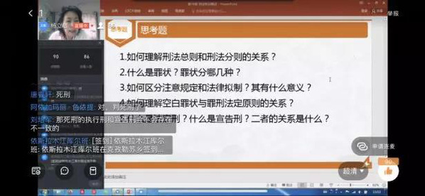 近日由于新型冠状病毒的肆虐,为了保障老师、同学们的身体健康,包括我校在内的国内高校决定延后开学。但为了同学们可以在家防疫的同时,学习知识充实自己,很多老师选择在网上授课。我校管理学院法学系182、171班共计92名同学,在杨立敏老师的带领下,于2020年2月25日12:00在网上学习《刑法分论》课程。