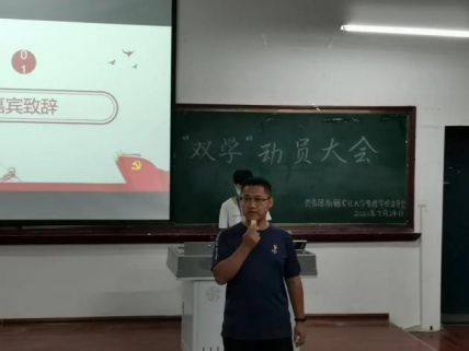 活动伊始,管理学院辅导员张俊杰老师作为嘉宾致辞,为我们讲解了“双学”的重要性,开展“双学”活动是提高同学们政治理论水平和政治思想觉悟的重要举措,是党建工作的重要组成部分。希望同学们通过此次的双学学习能够增加对党的基础理论知识的学习,能够树立正确的观念,在以后的学习和生活中能够树立远大理想信念,积极投身于校园文化建设。
