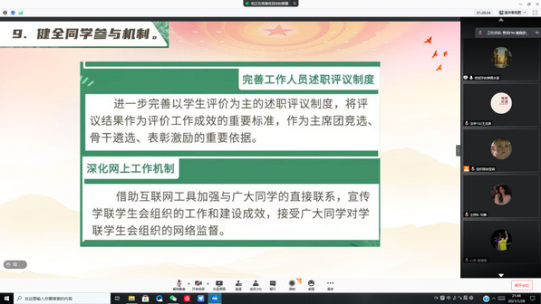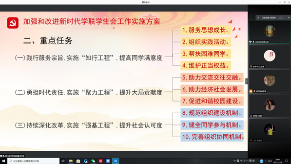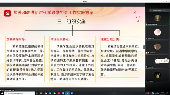 为深入贯彻习近平总书记致全国青联十三届全委会和全国学联第二十七次代表大会的贺信和党中央致词精神,全面落实全国学联二十七大确定的各项工作部署,加强和改进新时代学联学生会工作,管理学院团委、学生会特于1月28日20:30通过腾讯会议的形式组织学习《加强和改进新时代学联学生会工作实施方案》。本次会议由管理学院团委副书记佟冠宇同学带领团委、学生会全体学生干部共同学习。