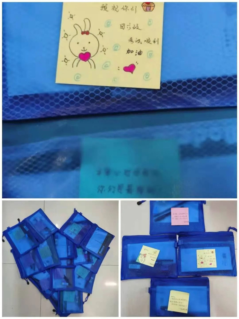 此外,老师向同学们逐一递上学院精心准备的小礼物——加油福袋。福袋内有笔记本、2B铅笔、碳素笔......袋内还藏有老师们的打气小便签。让同学们真真切切地感受到了学院的关怀与重视,内心更是满满的感动。
