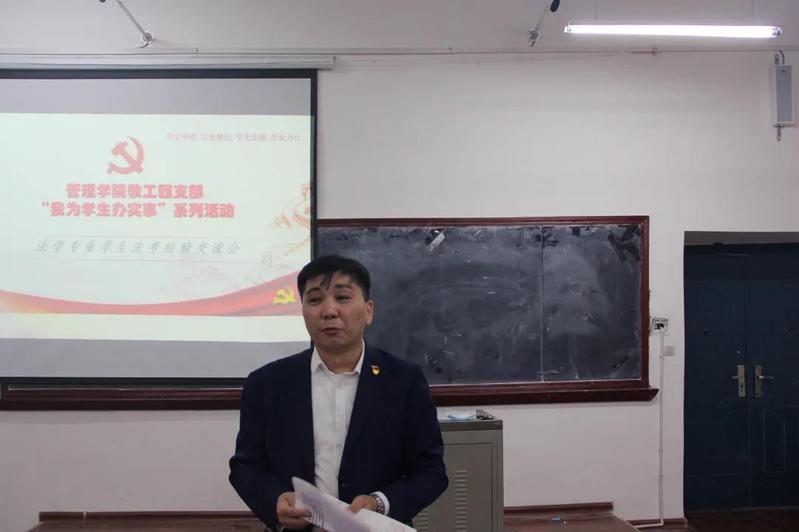 为加深同学们对法考的认识,明确今后学习的方向和目标,管理学院法学系2021年6月4日17点管理学院10216阶梯教室开展了“法考经验交流会”。管理学院教工四支部“我为学生办实事”系列活动,通过邀请了法学161班法考通过学生进行交流,传授法考通过经验,鼓励学生积极应对法考。