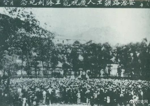 1922年9月14日-18日 安源路矿工人在毛泽东、李立三、刘少奇等组织领导下,举行罢工斗争,取得胜利。图为安源路矿工人庆祝罢工胜利。