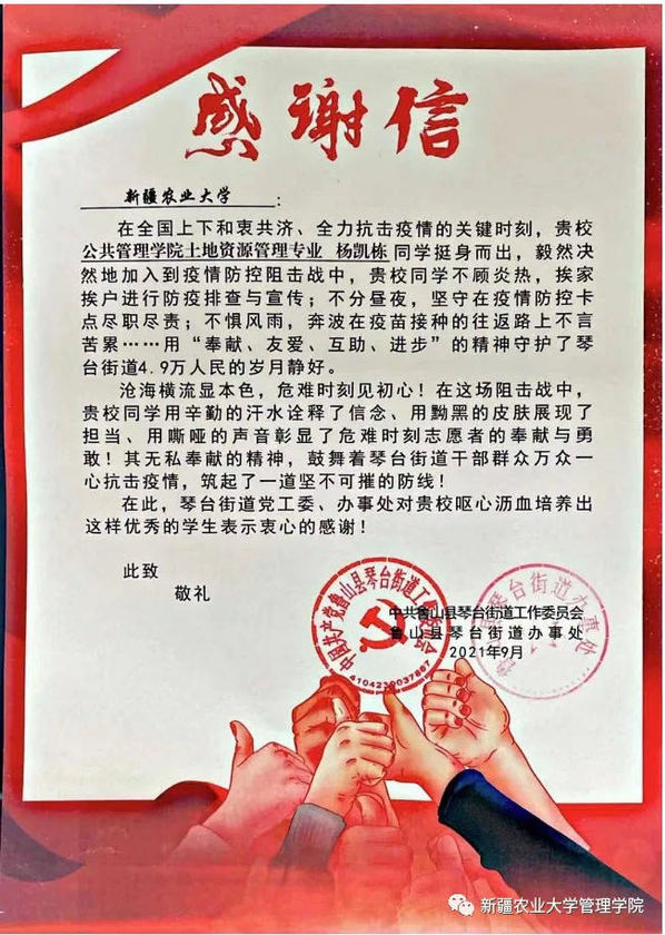 这封信从河南省平顶山市鲁山县的琴台街道办事处发出,对公共管理学院(法学院)2021级公共管理专业硕士研究生杨凯栋同学在暑假期间积极加入社区志愿服务队伍,协助社区工作人员开展疫情防控宣传、疫苗接种登记等工作提出表扬。