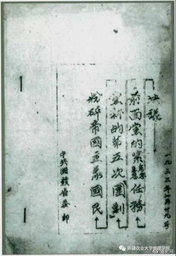 1933年7月29日,任弼时主持中共湘赣省委作出的《粉碎帝国主义国民党新的第五次“围剿”前面党的紧急任务决议》。