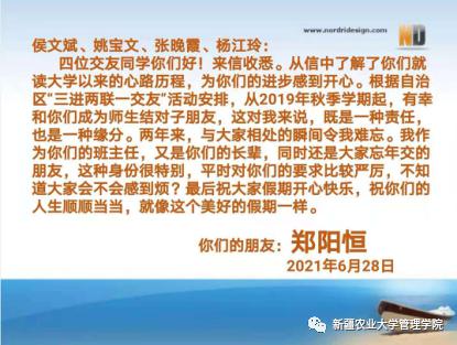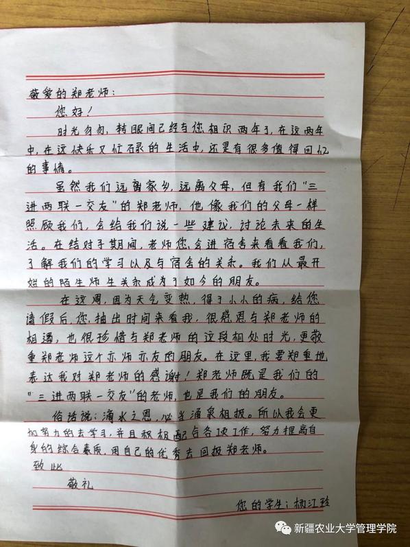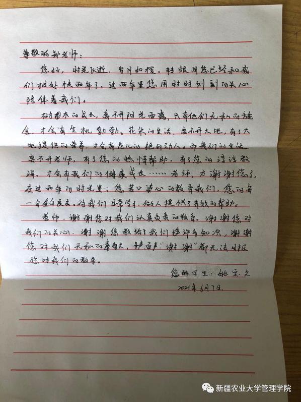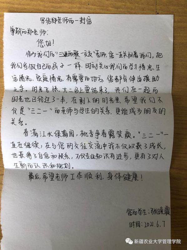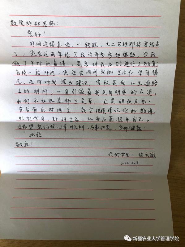 郑阳恒老师以梦想为蓝图,为学生绘画青春;以启迪为方法,扣开学生智慧的大门。您的交友学生:侯文斌、姚宝文、张晚霞、杨江玲在给您的信中都提到了“指引”一词,进入大学,学生难免会有迷茫之时,没有方向,没有想法,漫无目的的游走着。与学生谈论未来,谈论规划,指引方向,为的就是不希望他们荒度大学这一段最为宝贵的时间段。他们必定会因为您的指导而健康成长,必定会因为您的教导而遨游知识的海洋,必定会因为您的目光而努力变得更加优秀。他们怀着诚恳的感恩之心谢谢您,感谢您的关心与付出。