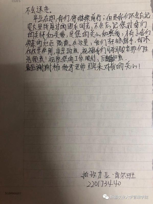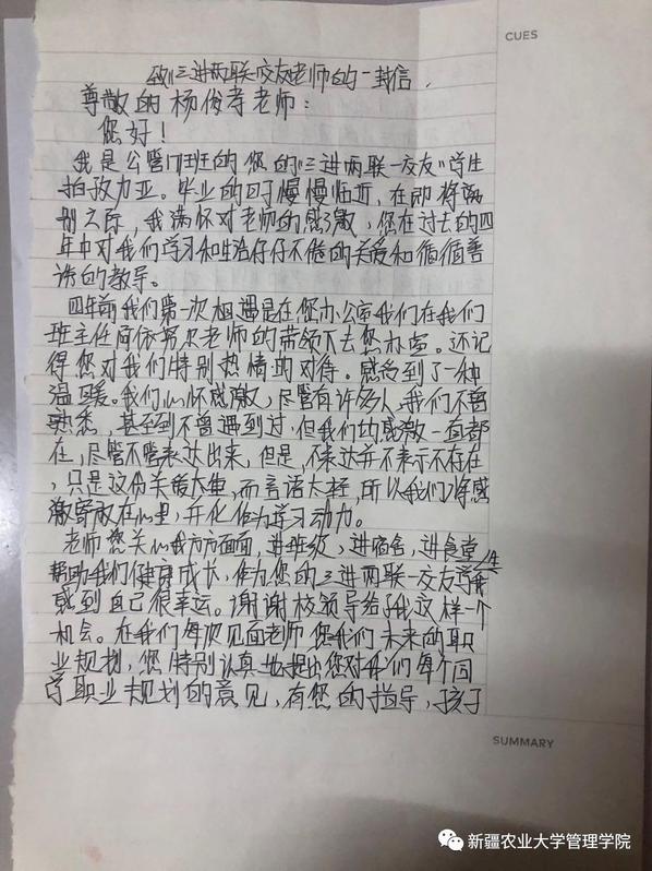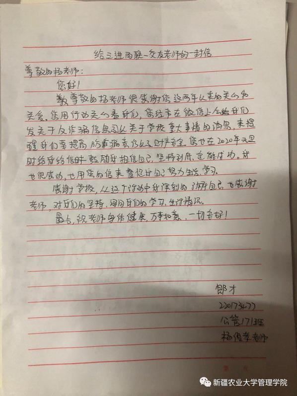 老师,您用平等的眼光看待每一名学生,无微不至地关怀、爱护我们。红花最清楚绿叶的无私,鸟儿最知道天空的广阔,作为您的学生,郎才和拍孜力亚最能体会您的良苦用心,作为您的“三二一”交友学生,他们内心满怀感激和庆幸,感激的是老师对他们生活上的关心,能够陪伴他们成长,庆幸的是遇见了能够在学业上为我们指点迷津,在生活上给予帮助,在精神上支持我们前行的好老师。老师就是这样在课堂上严肃,在生活上和蔼的人,严肃且可爱就是说的每一位孜孜不倦的老师。