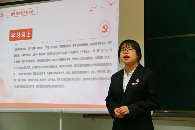宣讲人刘慧聪结合自己的感悟,向大家讲述雷锋同志的生平和雷锋精神内涵及时代意义,并从在校大学生自身生活出发,带领大家探寻我们身边的先进榜样。宣讲中,雷锋同志不再只是一个活在教科书里的人物,而是一个有血有肉形象鲜明的形象。