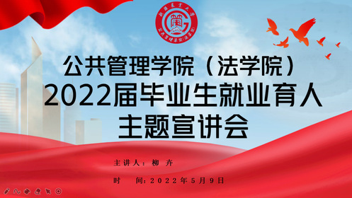 为切实做好学院2022届毕业生就业工作,帮助学院2022届毕业生了解当前就业形势、把握就业机会、实现优质就业,2022年5月9日20:00,公共管理学院(法学院)举办了2022届毕业生就业育人线上宣讲会。主讲人为学院党委副书记、纪委书记柳卉,学院全体毕业生及毕业班班主任参加了此次宣讲会,宣讲会由学院就业专干王亭亭主持。