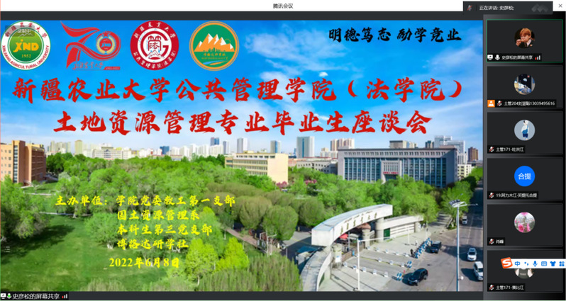 为征询毕业生对土地资源管理专业教育教学各个环节的意见和建议,6月8日20点30分,公共管理学院(法学院)教工第一党支部、国土资源管理系、学院本科生第三党支部和博格达研学社以线上+线下的方式组织召开了2022届土地资源管理专业毕业生座谈会,会议由教工第一支部书记邵战林主持。