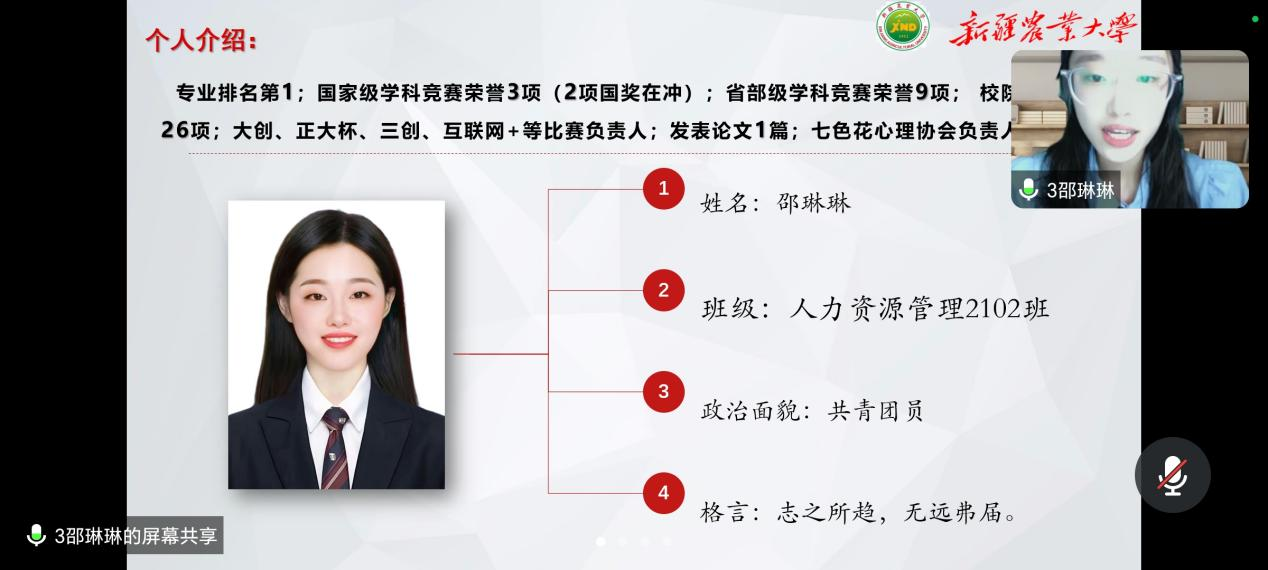 人资2102班邵琳琳同学结合正在访学的感想说道:我们的人生不应囿于某种固有的形状,要不断迈出自己的舒适区,国家奖学金对我来说,不仅是一项荣誉,更是一种责任。我一直相信,灿若星辰不是只要求自己有多璀璨,而是你的光芒到底能够照耀多少人。