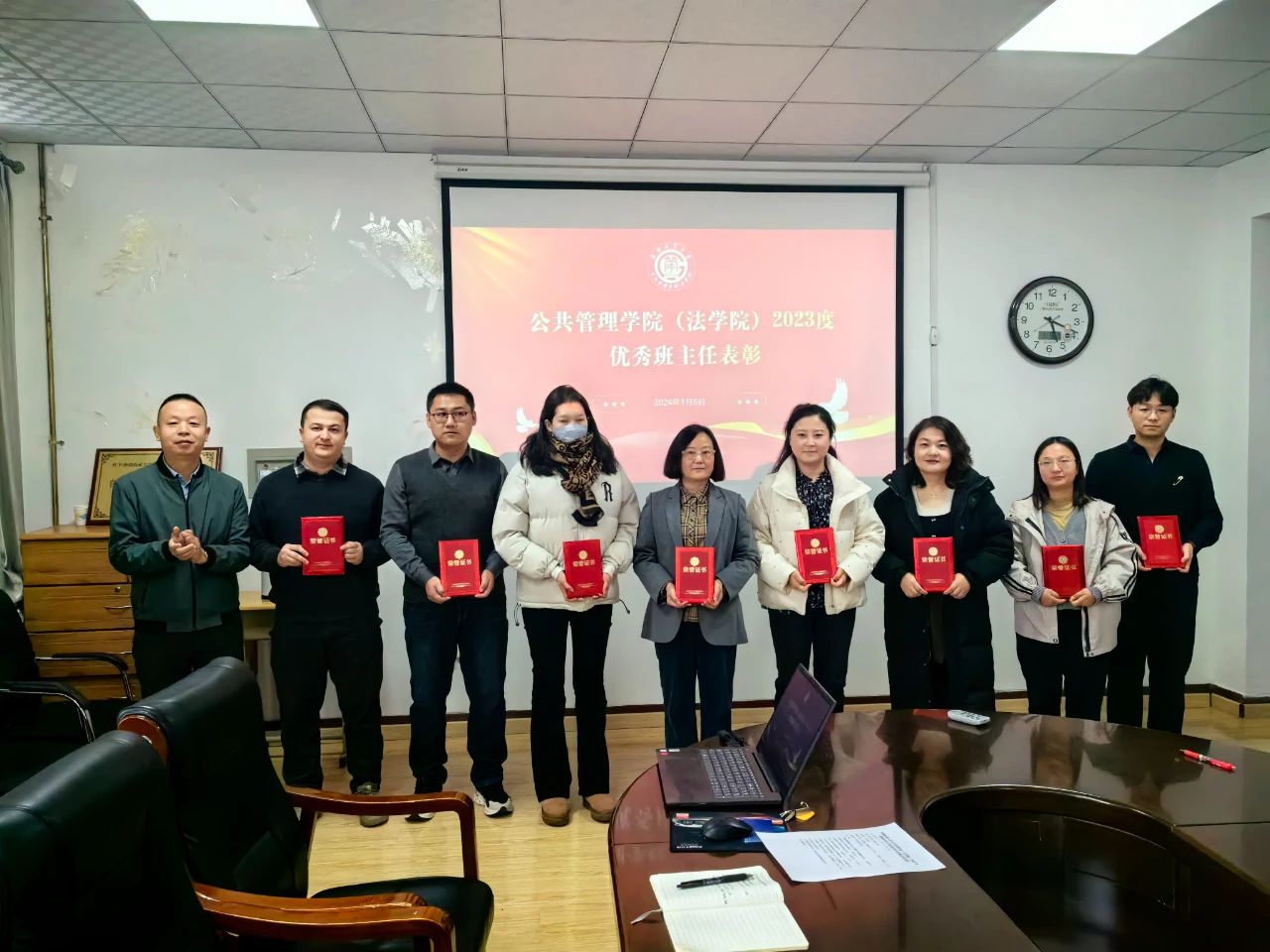 随后对学院2023年度获得优秀班主任的韩芳、张俊杰、王爽、夏依旦·瓦力、王颖、菊春燕、刘鹏、依麻木江·沙力江等8名老师进行表彰。