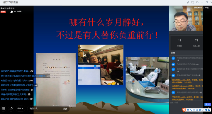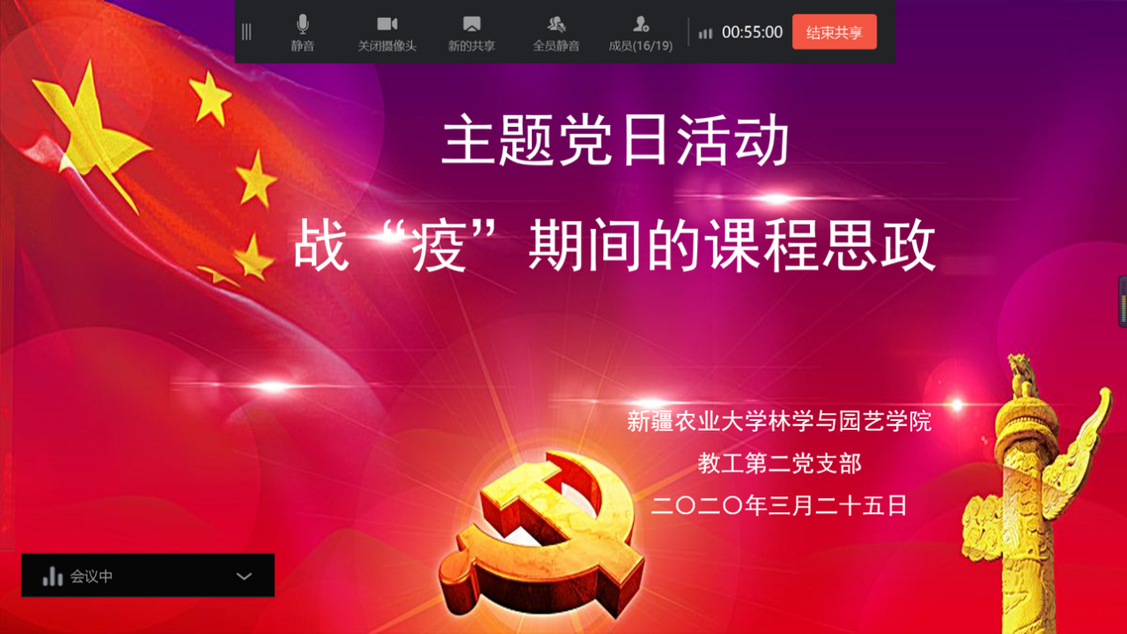 教工第二党支部在加强疫情防控期间政治学习的基础上,重点探讨以线上教学为载体,战“疫”课程思政的思路、方法和举措,并推进在线上教学中的具体落实。例如田嘉老师在《园艺植物育种学》网络教学中号召同学们要以园艺171班和园艺183班同学在疫情期间参加战“疫”志愿者行动、身处“灾区”湖北同学的坚守、听党话的4万2千名的医务“逆行者”为榜样。姜秀梅老师在《蔬菜栽培学》网络教学中号召同学们要积极参加春耕备耕生产,在脱贫攻坚的事业中贡献青春力量,并从新疆驰援湖北的物资入手进入教学环节。耿文娟老师在《园艺专业英语》开课前利用多媒体视频进入战“疫”主题,歌颂在这场抗击疫情战役中最美的逆行者、最勇敢的白衣战士。林辰壹老师在《食用菌栽培学》课程中强调,要从自身做起,拒绝捕杀和掠食野生动物。李文胜老师在《果树栽培学总论》总结到“哪有什么岁月静好,只不过有人替你负重前行”,以“方舱医院”读书男孩为例勉励同学们要不负韶华、刻苦学习。高杰、周龙、董连新、刘立强、玉苏甫、王惠林、闫会转、依巴代提、温玥、张翠芳、曼苏尔等园艺系教师纷纷结合承担课程开展课程思政,进行课堂战‘疫’活动。