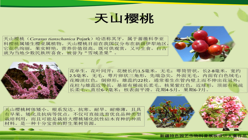 全国科普日活动系列之《新疆园艺作物展板大赛》历时近2个月,我们收到新疆各个高校和单位选送作品49份,收到的参赛作品涵盖新疆特色果树、特色蔬菜、西甜瓜和花卉,在此新疆维吾尔自治区园艺学会对所有选手的积极参加表示感谢,通过评委们认真筛选和复审发现本次参赛作品普遍还存在质量不高,很多参赛选手没有仔细阅读展板设计要求导致变成了科研展板,科普化、大众化、通俗化不强;有的选手将自己的姓名署名和单位设计在展板上,这给后期的评审带来诸多不便,也不符合展板设计要求;为了鼓励大家参与学会工作的积极性,奖励先进鼓励后浪,现将评审获奖名单公布如下,如果有任何疑问可以在公示后10个工作日内与大赛组委会联系。