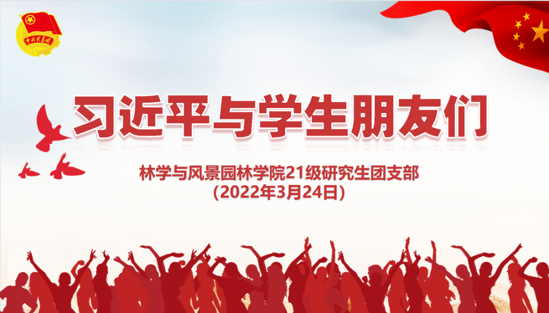 为深入学习贯彻习近平总书记关于青年工作的重要思想,持续强化建党百年激发的爱党爱国爱社会主义热情,引导团员青年自觉坚定听党话、跟党走的青春步伐,让广大青年以实际行动“喜迎二十大、永远跟党走、奋进新征程”,林学与风景园林学院2021级研究生团支部于3月24日召开了以“习近平与学生朋友们”为主题的团日活动。