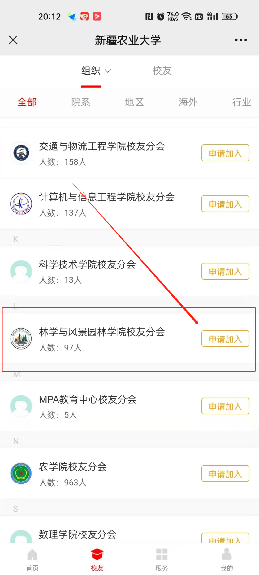 4.在点击“校友”一栏后,寻找学院点击“申请进入”