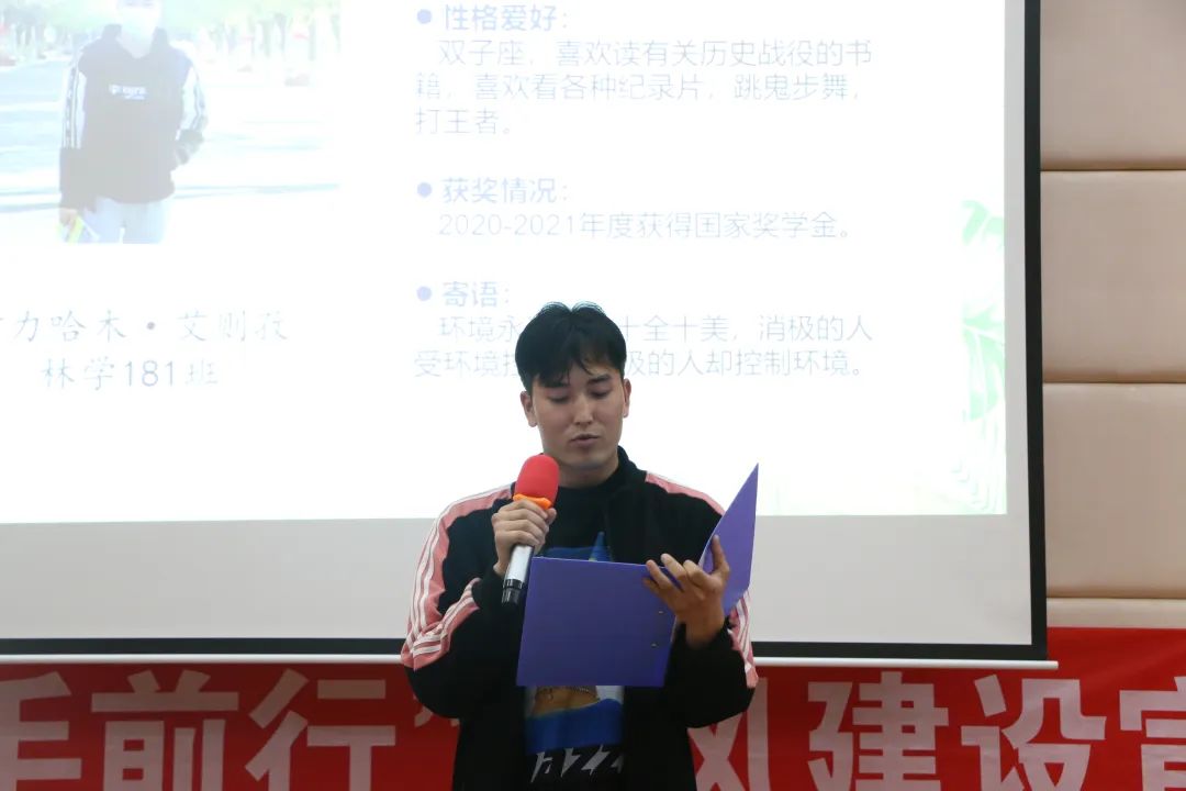 林学181班伊力哈木·艾则孜作为少数民族同学代表进行发言,他说“语言类的学习最重要的就是多读多练多问”。他告诉大家其实自己的汉语水平一开始并不好,但是通过不断练习,他取得了很大进步,在英语方面也没有落下,由于严格自律他拿到了国家奖学金。