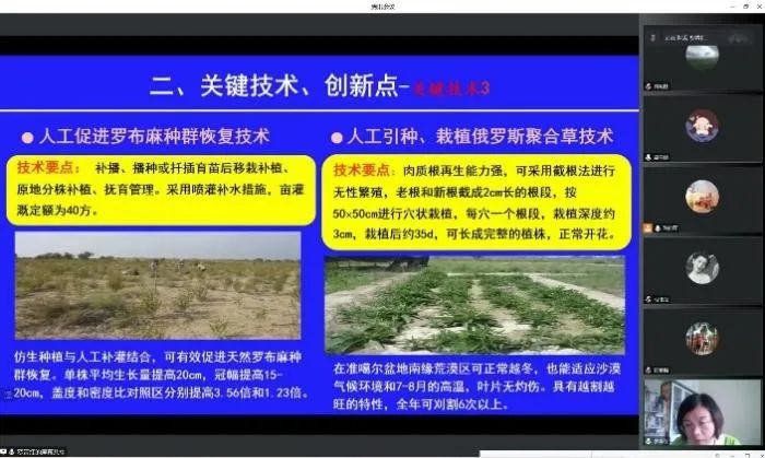 吉小敏研究员任新疆精河荒漠生态定位站站长,主要从事生态恢复和重建、生态监测和荒漠化防治等方面的科研和推广工作,此次报告的主题为荒漠化防治技术与模式的学术讲座。吉小敏研究员着重讲述植物固沙的原理及技术,分享了大量的荒漠化防治实践案例,结合目前的研究进展,引出对新疆荒漠化防治目前存在问题的思考。鲁艳副研究员主要从事干旱区恢复生态学方面研究,此次报告结合新疆第三次科学考察,讲解了荒漠盐生植物的种类、特点及其开发利用,并针对国内外大量研究案例,做了详细讲解。