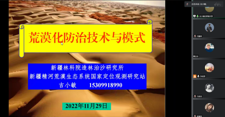 为了深入学习贯彻党的二十大精神,全面提升研究生教育教学水平,增强研究生科研、实践能力,拓宽研究生视野,林学与风景园林学院于2022年11月-12月邀请校外研究生导师持续为研究生开展学术讲座,本次讲座按照不同方向分别开展,首先进行的是林业生态工程建设与管理、荒漠化防治方向相关的科研讲座,分别邀请了新疆林科院的吉小敏研究员、李吉玫研究员和罗青红副研究员,中科院新疆生态与地理研究所的鲁艳副研究员来为研究生同学们分享学界与业界的科技前沿。