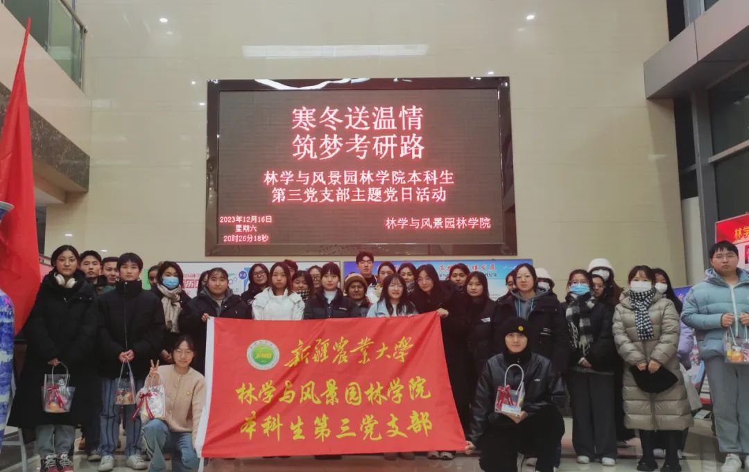 在2024年全国硕士研究生招生考试即将到来之际,为帮助党支部考研学子坚定信心、缓解压力,鼓舞考研士气,营造和谐温暖的学院氛围,传递温暖和力量,分享彼此的经验和心得,帮助大家更好地备战考研,2023年12月16日下午,林学与风景园林学院本科生第三党支部在院党委支持下组织开展“寒冬送温情 筑梦考研路”主题党日活动。