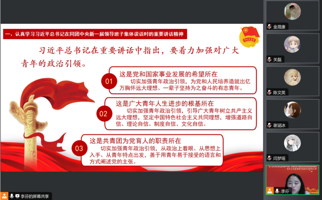 我们要在全面学习、全面把握、全面落实上下功夫,深刻感悟以习近平同志为核心的党中央对新时代共青团和中国青年的信任与厚望,牢牢把握新时代青年工作的主题和方向,紧紧围绕加强政治引领、服务中心大局、勇于自我革命等根本要求,切实肩负起新时代新征程党赋予的使命任务。更要在中国式现代化建设中展现我辈青年的青春活力,奋发图强,挺膺担当。