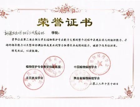 经过激烈角逐,我院参赛团队获得全国单项(昆虫解剖与结构绘画)三等奖(夏丽华),并同时荣获团体优秀奖和优秀组织奖各一项。本次大赛是我院首次参加植物保护专业能力大赛,在比赛中,参赛团队与来自其他高校的选手进行交流和互动,相互学习、探讨问题和分享经验。团队成员们还深入参与了展示的优秀项目,了解先进的植保科技发展和应用,同时也为研究生阶段的科研发展积累了宝贵的经验。
