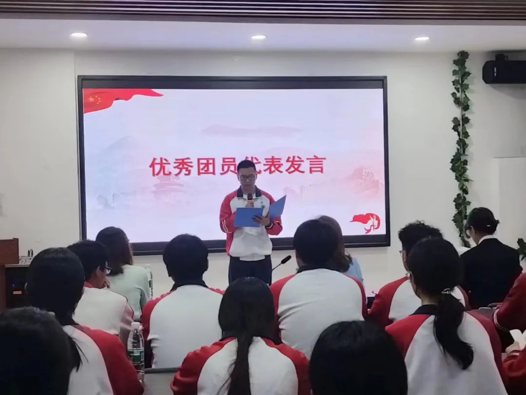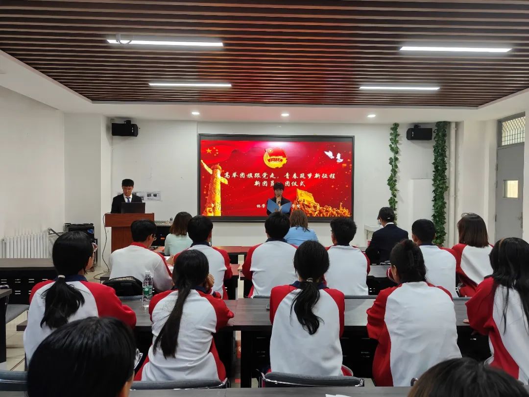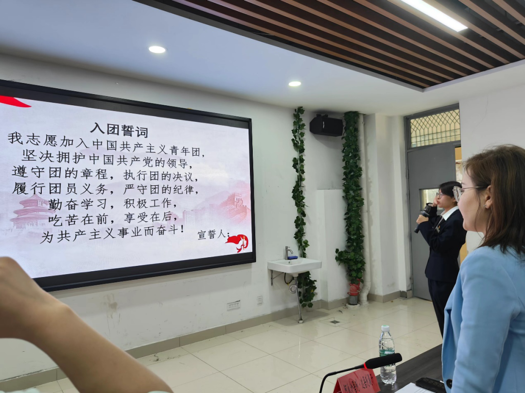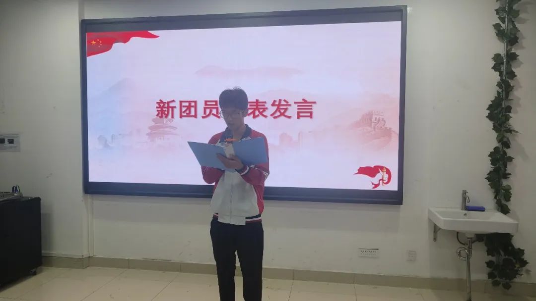 团委副书记李昕洋同学领誓:我志愿加入中国共产主义青年团,坚决拥护中国共产党的领导,遵守团的章程、执行团的决议、履行团员义务,严守团的纪律,勤奋学习、积极工作、吃苦在前、享受在后,为共产主义事业而奋斗。