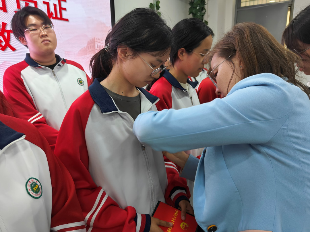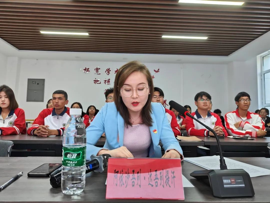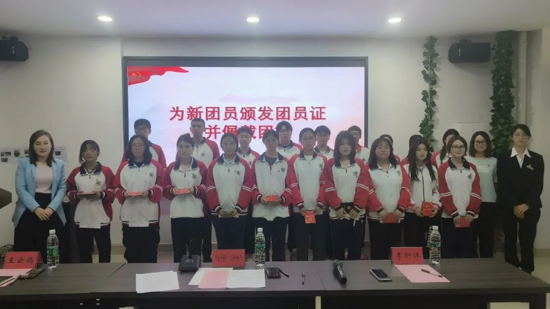 庄严的国歌奏唱完毕,团委书记阿依沙吾列·达吾列提汗老师致开场辞并宣布新团员名单,同时提出殷切希望。她说到,希望大家时刻牢记自己共青团员的身份,用自己的实际行动表明自己能够担当得起“共青团员”这个光彩的称号。随后阿依沙吾列·达吾列提汗老师、李昕洋同学、王云鸽同学为新团员颁发团员证及团徽。