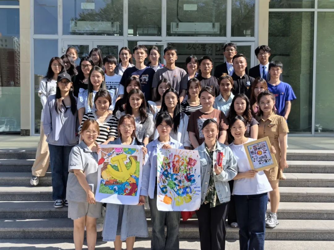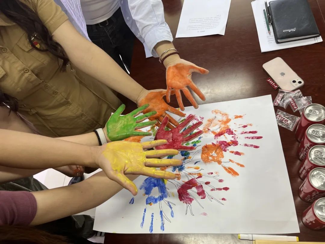 同时支部党员将鲜艳的色彩涂于掌心,印于画布,将大家手中的力量与信仰凝聚在一起,构成了一副绚丽多彩的图画,犹如大家五彩斑斓的未来,希望大家在新的征程上,前程似锦,未来可期。