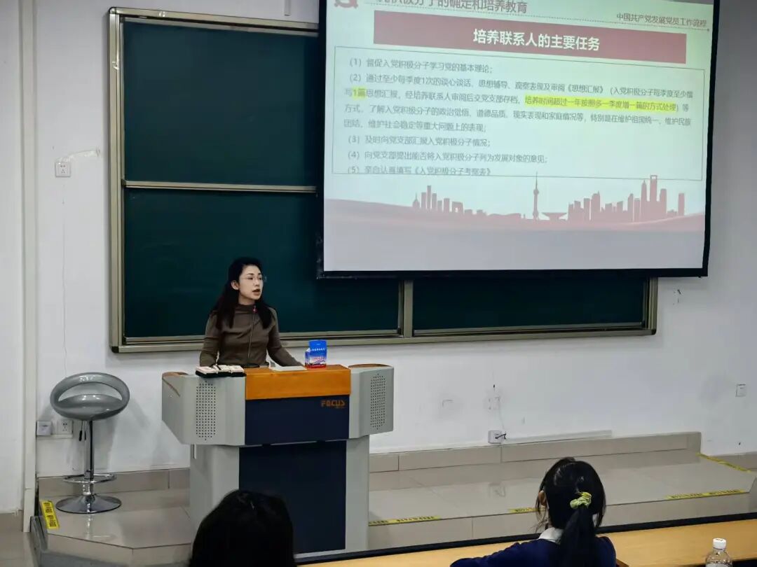 林学与风景园林学院本科生第二党支部书记孜米兰·赛吾丁面向园林、森林保护专业的学生进行讲解。她重点介绍了中国共产党发展党员工作流程,详细讲解了入党申请书等材料的书写规范,强调作为新时代大学生要深刻认识自身肩负的时代责任,以实际行动积极向党组织靠拢,争取早日成为一名合格的共产党员。