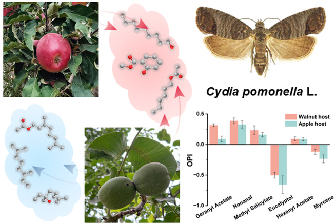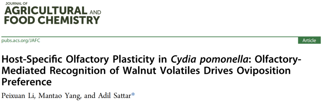 究其原因,当苹果蠹蛾跨界危害核桃园背后竟藏着植物挥发物与嗅觉基因的“精妙博弈”。星空彩票体彩版林学与风景园林学院阿地力·沙塔尔教授团队在《Journal of Agricultural and Food Chemistry》(中科院一区,IF = 6.2)发表了研究成果,论文题为“Host-Specific Olfactory Plasticity in Cydia pomonella: OlfactoryMediated Recognition of Walnut Volatiles Drives Oviposition Preference”。对苹果蠹蛾寄主转化之间的嗅觉差异进行研究,为果园害虫精准防控提供了新方向。