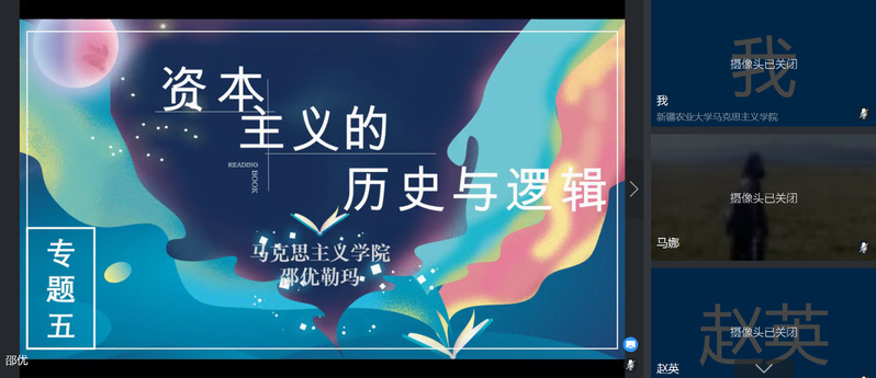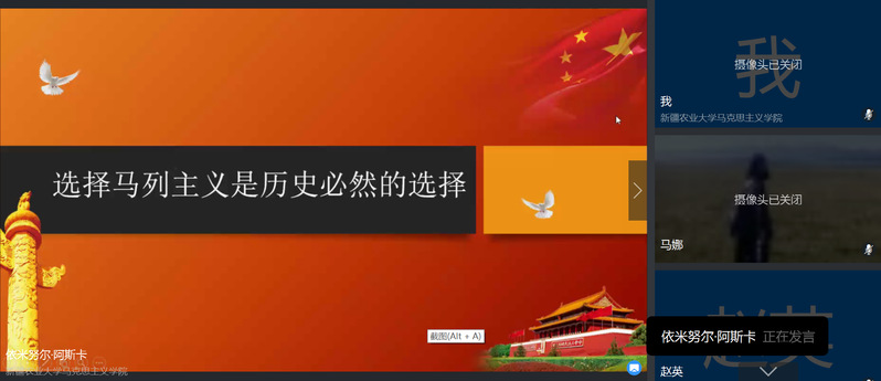 本次展示采用“线上直播”的方式进行,虽然大家面对屏幕,但是丝毫不影响老师们的发挥。学院李然、沈建刚、依米努尔、邵优勒玛、乔秀丽、李进六位教师依次展示。他们有的结合此次疫情,强调坚持以人民为中心的思想的正确性;有的以生动的案例,阐释中国革命的基本经验以及选择马列主义的历史必然性;有的引经据典,将资本主义的历史与逻辑娓娓道来;有的用疫情中的暖心故事生动讲解社会主义道德建设的核心;有的用辩证的理论、原创歌曲让我们深刻的理解了人生价值的评价与实现。