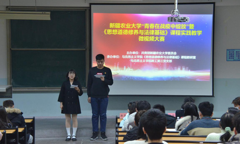 2020年12月13日晚,由校团委主办、我院“思想道德修养与法律基础”教研室、教工第三党支部承办的“青春在战‘疫’中绽放”暨“思想道德修养与法律基础”课程实践教学微视频大赛在二号教学楼2120教室举行。