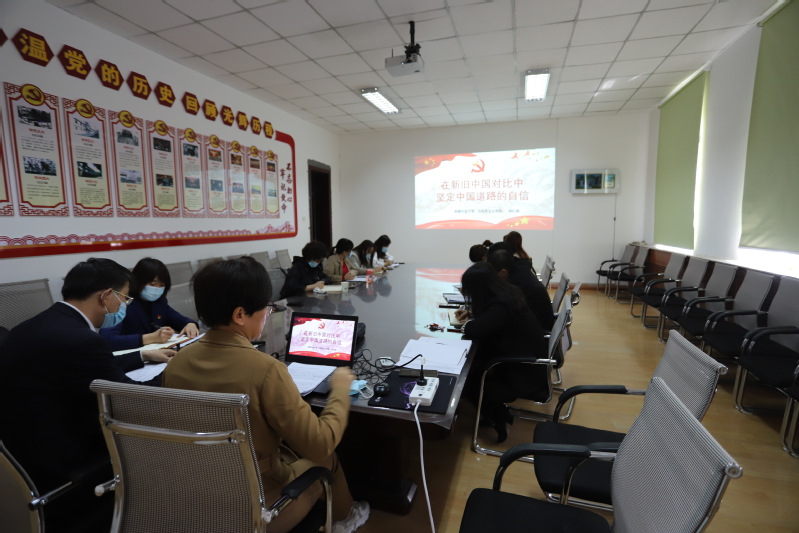 之后,学院第二党支部书记裴红娟副教授为全体教师做了题为《在新旧中国对比中坚定中国道路的自信》的主题宣讲。宣讲选取视角独特新颖,分别从中国道路的提出、在比较中认识中国道路和增强中国特色社会主义的道路自信三个层面,通过讲解和对比中国共产党带领中国人民从百年沧桑到翻天覆地的变化,让全体教师深刻而生动地感受到党的历史是最生动、最有说服力的教科书。裴红娟老师总结道:“回看走过的路,我们的道路自信源于近代以来中华民族由衰到盛的历史进程;比较别人的路,道路自信基于同其他国家发展历程的鲜明对比;远眺前行的路,我们要坚定不移沿着中国特色社会主义道路实现中华民族伟大复兴。”
