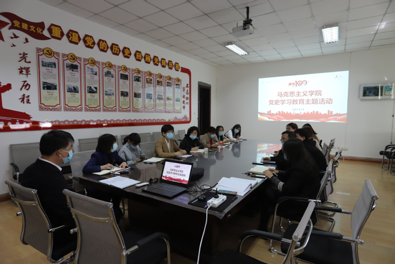 4月14日下午,马克思主义学院全体在校老师在学院会议室、校外老师通过钉钉会议共同参与党史学习教育主题活动。会议由贾友军院长主持。