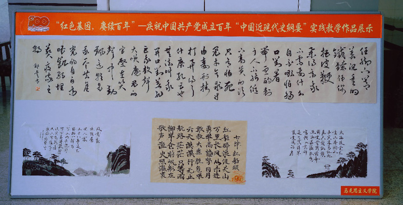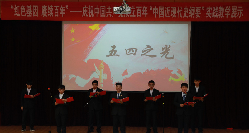 此次活动由马克思主义学院纲要教研室、教工第二党支部具体负责。自3月开学以来,全校大一新开课班级全覆盖开展教学实践活动,活动主要分为两种形式:一是通过书法文艺作品献礼建党百年,二是通过诗歌朗诵、情景剧等多种表现形式礼赞党的百年华诞。经过三个月充分的准备,在授课教师的精心指导下,历经分组、选题、初赛、选拔赛等环节,从全校大一年级开课班级中选出25个优秀小组参与初赛,最终选出10个优秀小组参加本次展示活动。