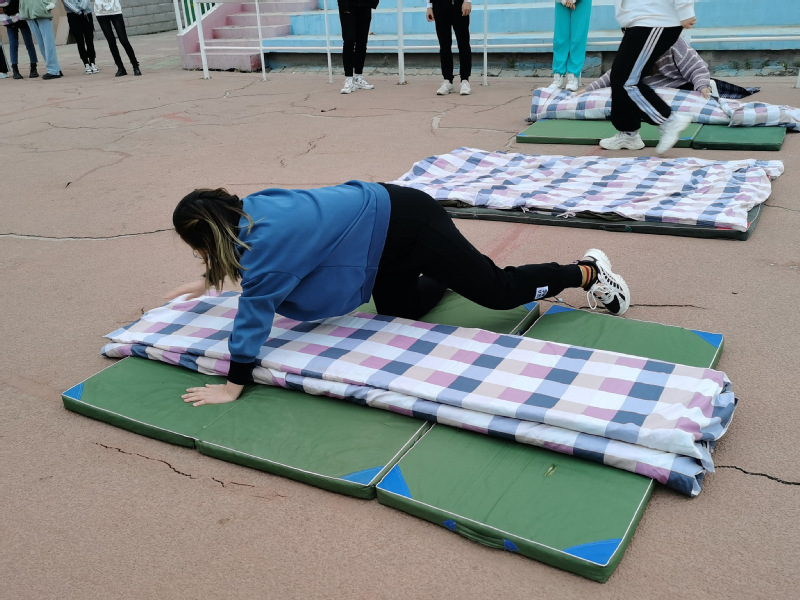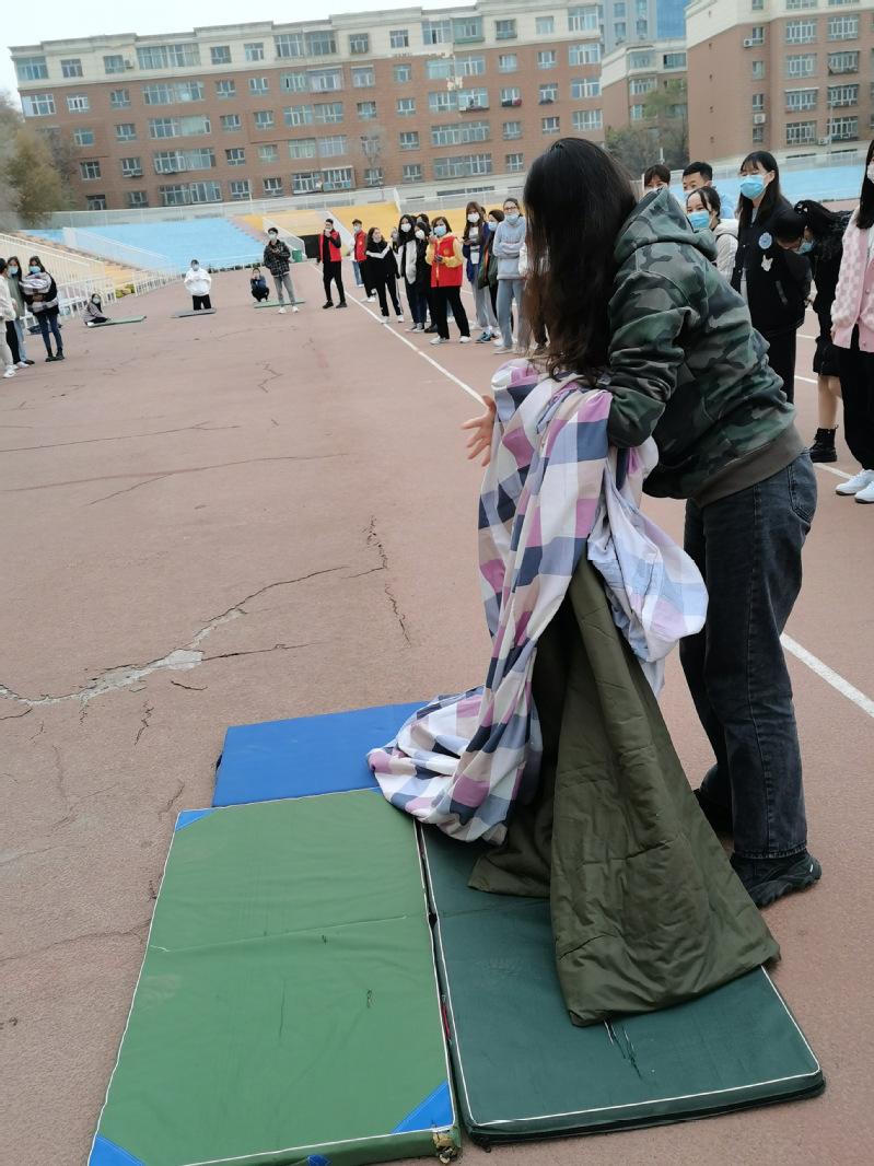 比赛活动中,联谊的师生表现出极高的兴致和热情,学生以宿舍为单位开始激烈的角逐,赛场呈现出团结合作、紧张振奋、你追我赶的比赛气氛。与苗志娟老师“结对子”的四名大学生率先加入比赛“战团”,拆被套,套被套,叠“豆腐块”,苗志娟老师则对大学生完成“作品”全程进行指导和鼓舞。师生组合最后获得内务技能大赛二等奖的好成绩。