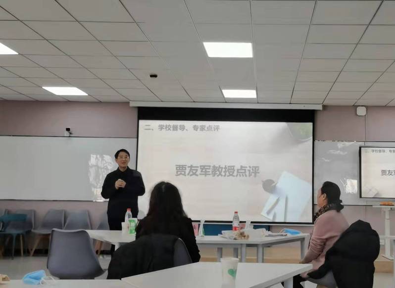 接着,贾友军教授进行点评。他对青年教师的培养提出三点期望,一是年轻人要多努力,学院多搭建平台,让青年教师有更多的展示机会;二是着眼新进教师的特点和教师未来的发展,加强管理、注重引导;三是建议所有教师对教学多些敬畏,多些尊重,努力实现走进课堂、驾驭课堂、享受课堂的目标。