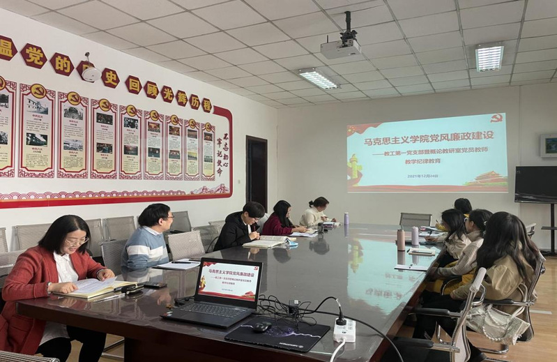 2021年12月24日上午,马克思主义学院教工第一党支部暨概论教研室党员教师在马克思主义学院会议室开展了关于教学纪律教育的党风廉政建设。教工第一党支部书记苗志娟及第一党支部全体党员教师、教工第二党支部书记裴红娟、教工第三党支部书记李然参加此次学习教育。