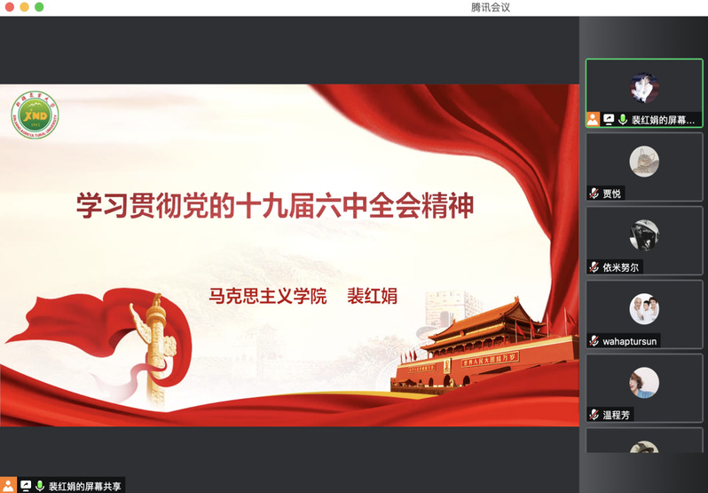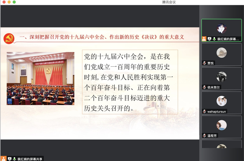 为深入学习贯彻党的十九届六中全会精神,把学习好、宣传好、贯彻好全会精神作为一项重要政治任务,带动支部教师自觉自愿理论学习的热情,按照支部5月份的工作安排,马克思主义学院教工第二党支部在2022年5月18日下午,组织支部党员召开一次线上理论学习研讨,支部书记裴红娟以“学习贯彻十九届六中全会精神”为主题进行了一次党课宣讲。希望达到理论学习不停歇,常学常新悟思想的效果。全体支部教师线上参加学习。