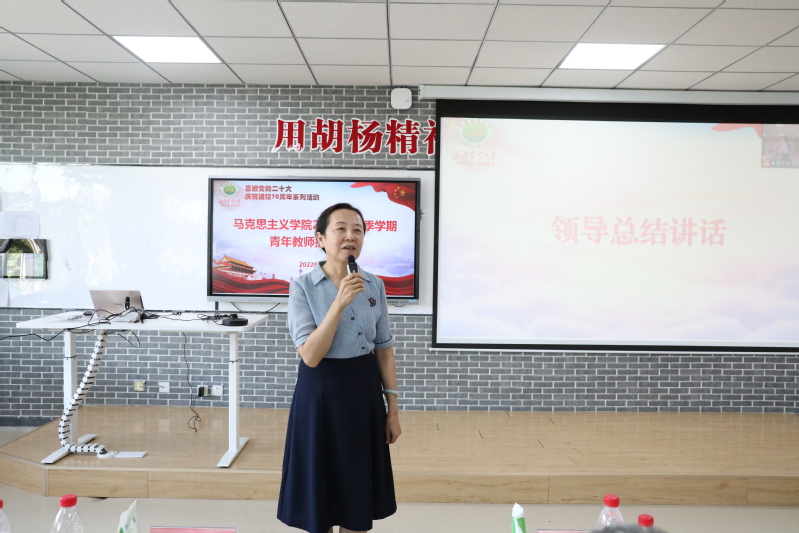 张小楠副校长在总结讲话中充分肯定了8位青年教师的精彩展示。她表示,此次活动是学院所有教师之间的一次交流学习,不仅给青年教师创造了磨练的机会,也增强了学院教师的使命感和荣誉感。她就学院做好今后的工作提出三点要求:一是深刻领会习近平总书记关于思政课本质是讲道理的论断,把道理讲深、讲透、讲活。二是积极发挥教研室的团队合作力量,凝聚集体智慧,推进一流课程建设。三是要继承优良传统,不断创新工作方式方法,积极搭建平台,多措并举,助推青年教师成长与能力提升。