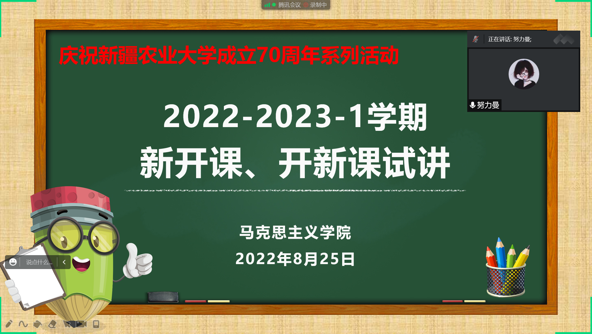 为加强思政课教师队伍建设,努力提高思政课教学质量,保证新学期教学工作的顺利开展,以饱满的姿态和良好的状态迎接建校70周年。学院于8月25日、26日开展了2022年秋季学期新开课、开新课试讲活动,试讲采用线上腾讯会议方式进行。校党委常委、副校长、马克思主义学院院长张小楠、学院党总支书记艾尼瓦尔·阿合买提、副院长努力曼·依米提、副院长蒲丽霞、院长助理张涛、各教研室主任及部分骨干教师参与指导,6名2022年新入职教师以及5名新开设公共选修课的教师试讲。
