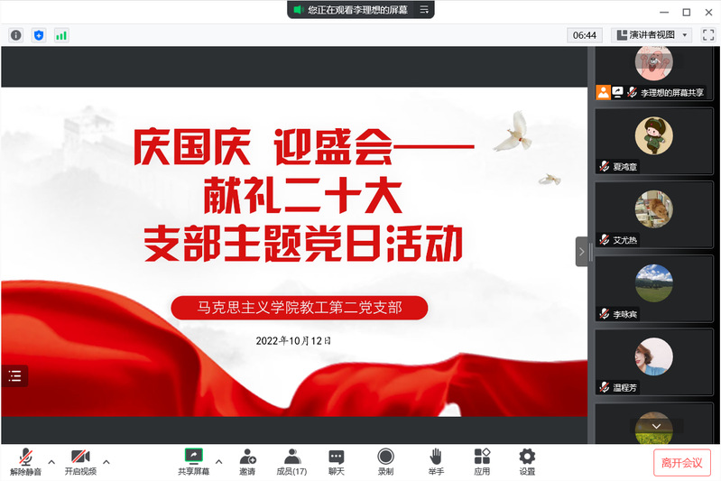 为迎接中华人民共和国成立73周年,弘扬以爱国主义为核心的民族精神和以改革创新为核心的时代精神,进一步增强党支部成员不忘初心、实干担当、奋发有为的自觉性、主动性、创造性,喜迎二十大的召开,10月12日下午18:00马克思主义学院教工第二党支部在腾讯会议召开了以“庆国庆 迎盛会——献礼二十大” 为主题的党日活动。支部全体成员参加了此次会议,李理想负责主持此次会议。