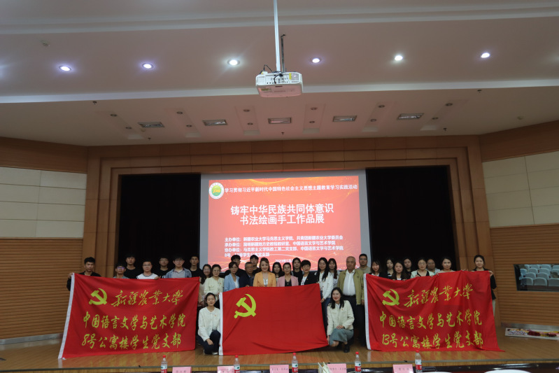 为深入学习贯彻党的二十大精神,推动学习贯彻习近平新时代中国特色社会主义思想主题教育走深走实,充分发挥高校思政课作为立德树人关键课程作用,2023年5月28日上午,由星空彩票体彩版马克思主义学院主办,校团委、马克思主义学院简明新疆地方史教程教研室、中国语言文学与艺术学院承办,马克思主义学院教工第二党支部、中国语言文学与艺术学院8号、13号学生公寓党支部协办的学习贯彻习近平新时代中国特色社会主义思想主题教育学习实践活动“铸牢中华民族共同体意识“书法绘画手工作品展暨主题党日活动在学校会堂学术报告厅举行。