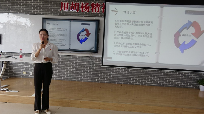 参加课程展示的有6位教师,按照抽签顺序依次展示。刘梦梦老师娓娓道来“从基层民主看社会主义核心价值观的真实性”,徐利红老师以歌曲的方式导入讲解了“实现中华民族伟大复兴的中国梦”,张莹老师结合近期热点话题阐述“坚持以人民服务为核心的社会主义道德”,曹圆圆老师以案例的方式详细讲解了“社会形态更替的一般规律及特殊形式”,刘彩霞老师以问答方式互动引出了“新民主主义革命的三大法宝之统一战线”主题并进行了详细阐述。阿克苏职业技术学院曹小远老师在线上以“中华民族的抗日战争——日本发动企图灭亡中国的侵略战争”为题做了精彩展示。