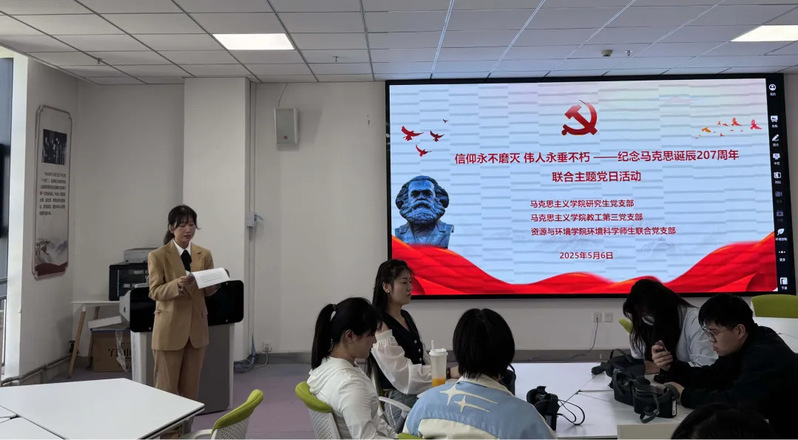 为深刻领悟马克思主义真理伟力,激励广大党员以科学理论武装头脑、以实践品格赓续信仰,5月6日下午,马克思主义学院研究生党支部、教工第三党支部、资源与环境学院环境科学师生联合党支部共同开展“信仰永不磨灭 伟人永垂不朽”纪念马克思诞辰207周年联合主题党日活动。活动由马克思主义学院研究生党支部书记毋立根主持。