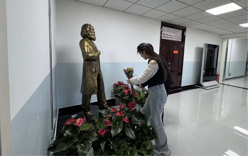 为表达对“千年第一思想家”的深切缅怀与崇高敬意,学生党员代表吴彦娇、何佳乐向马克思雕像敬献了鲜花。