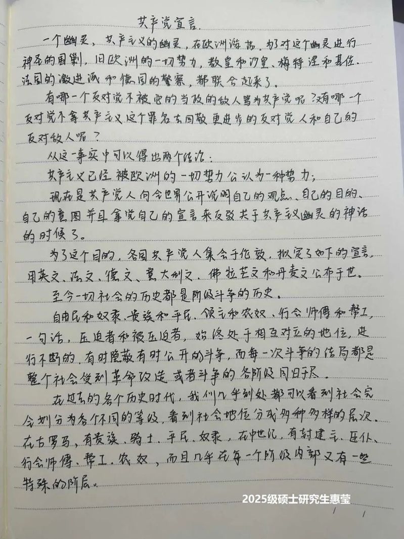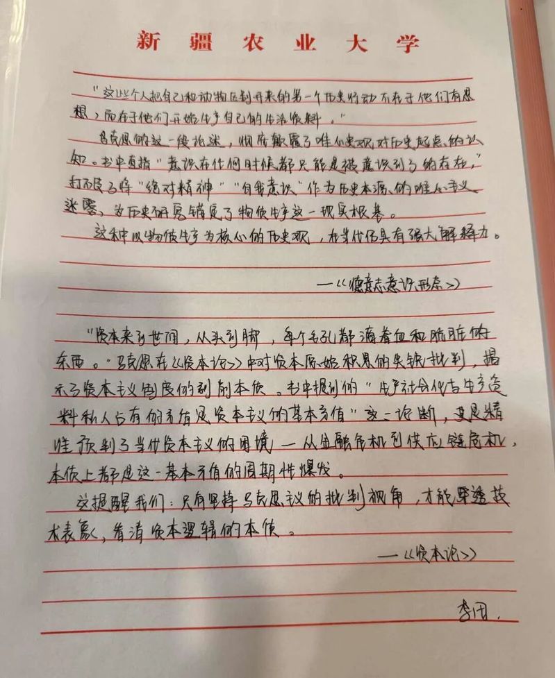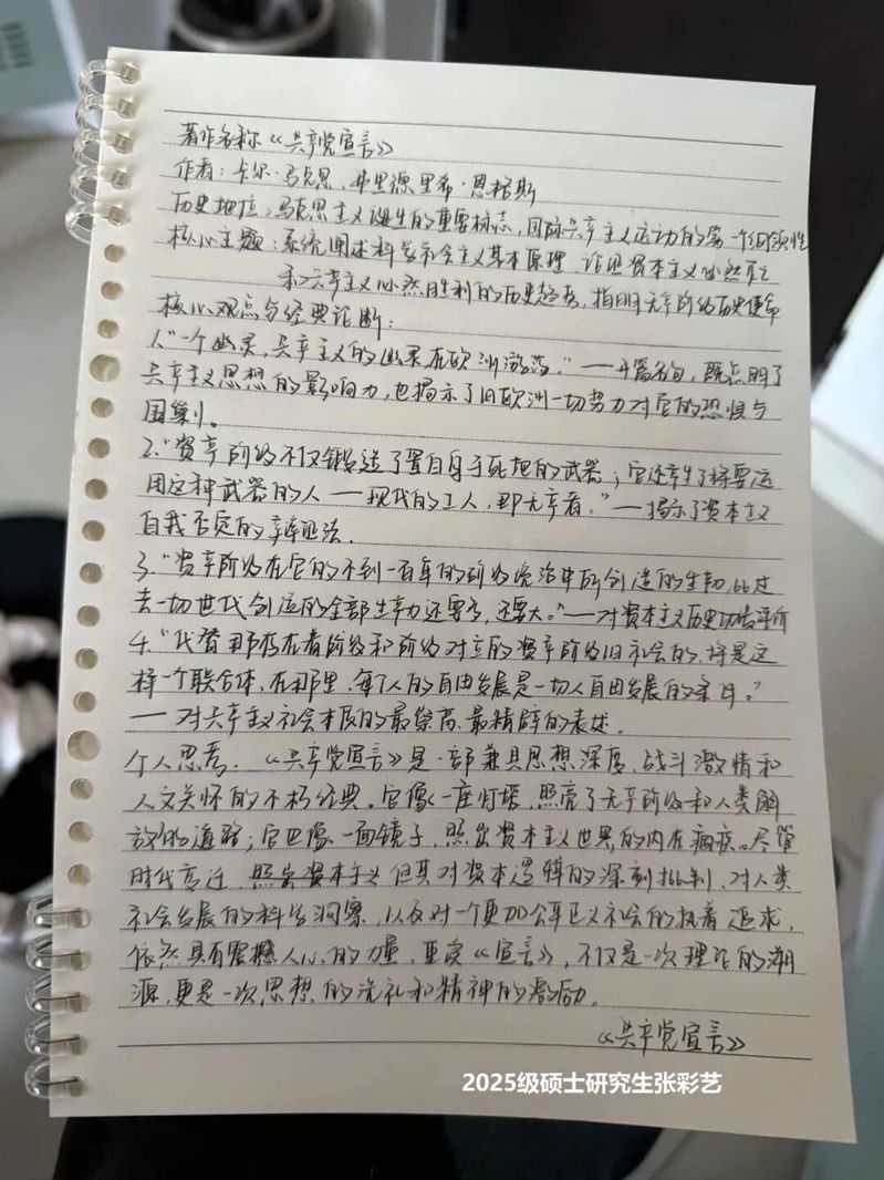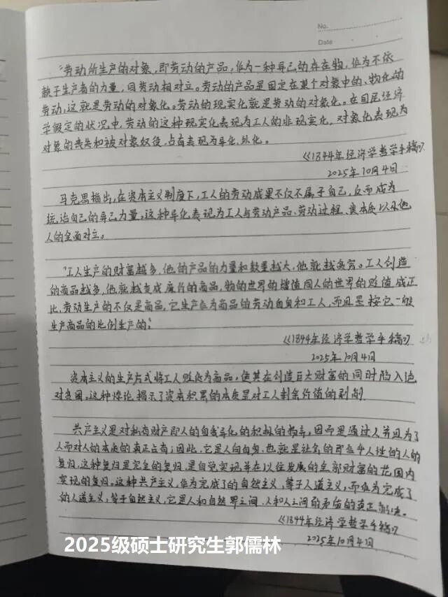 国庆假期,学院组织策划“马克思主义经典著作打卡暨读书笔记分享”活动,将理论学习与家国情怀培育深度结合。学院为同学们推荐马克思主义经典作家书目,同学们根据自身计划,每日阅读指定章节,以“手写批注+感悟随笔”的形式撰写读书笔记。在打卡过程中,同学们围绕经典著作中的重要观点展开讨论,深化对马克思主义理论的理解。此次活动,推动学院学子将理论学习融入日常,为专业学习与实践奠定坚实的思想基础。