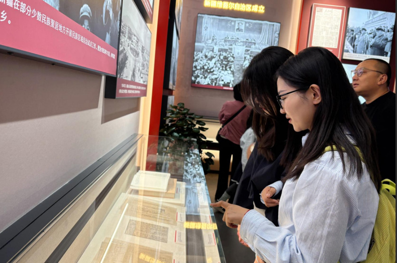 展馆里,一件件承载岁月记忆的实物、一幅幅记录发展变迁的图片、一组组彰显成就的数据,生动铺展开新疆维吾尔自治区成立70年来的奋斗画卷。同学们循着展览脉络沉浸式体验,深入了解新疆在各个领域取得的历史性成就,真切体会到这片土地70年来从落后到繁荣的不凡历程,同时也坚定了在中国共产党领导下建设美丽新疆、共圆祖国梦想的信心和决心。参观过程中,同学们不时驻足讨论,难掩内心的感慨与激动。“这个老式电视机和我小时候家里用的一模一样,没想到几十年间新疆的科技生活变化这么大!”“从落后到繁荣,真是波澜壮阔的70年!” 一句句真切话语,满含对新疆发展的赞叹,更流露着青年学子对这片土地的深厚情感。